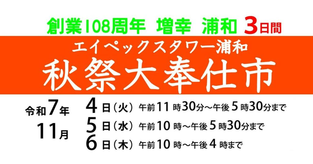 浦和エイペックスタワー「秋祭大奉仕市」 11/4(火)~6(木)