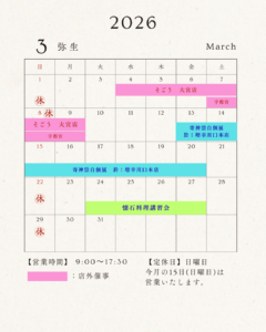 令和8年2月の増幸の予定 2026 3/09 カレンダー 2026年1月20日2026年3月9日 カレンダー ✨増幸本店 恒例縁起市 大売り出し!✨ 1/20(火)~27(火) 浦和エイペックスタワー茶道具展示会 2/2(月)~4(水) 関連記事 令和8年3月の増幸の予定 2026年2月20日 令和8年1月の増幸の予定 2025年12月28日 年末年始休業のお知らせ 2025年12月23日 コメント コメントする コメントをキャンセルコメント ※ 名前 ※ メール ※ サイト 次回のコメントで使用するためブラウザーに自分の名前、メールアドレス、サイトを保存する。